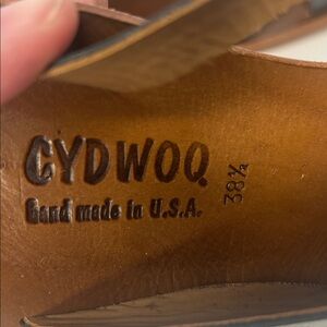 CYDWOQ Sandals, Size 38.5 ( 8.5 per Size Chart), Color - Pewter/Silver with Tan Bottom, Thong with Toe Strap, Leather, Handmade, Description/Size Chart/ Measurements in pics, Light Wear on Sole Bottom