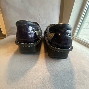 Experience unparalleled comfort with Alegria's black mules, designed for easy slip-on wear. These clogs feature a sleek black finish, perfect for both casual outings and professional settings. With a rounded toe and supportive sole, they offer all-day comfort and style.