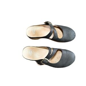 Chic black leather clogs with a stylish buckle. Comfortable and versatile for everyday wear.