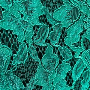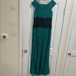 Stunning emerald and black lace dress with elegant black lace waistband. Perfect for formal events.