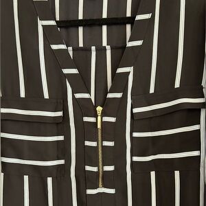 Stylish top featuring bold black and white stripes. Modern design with a sleek finish. Gold front quarter zip. Able to change sleeves from full length to 3/4 sleeves.