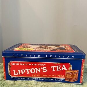 Vintage-style Lipton's Tea tin box with vibrant blue and red design. Features classic tea advertisement artwork.