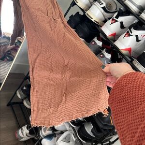 Soft waffle wide leg pants. Almost a gauzy flowy material. Perfect for relaxing. From aerie’s pool to party collection. They’re an xxs but really stretchy and pretty oversized, especially since they’re wide leg. I cut off the bottoms quite a bit and they’re still too long on me a bit. I’m 5 foot tall and they touch the ground so if you’re a little taller than that they should fit just fine. Marked as good condition only because I cut off the bottoms. Otherwise they’re in perfect condition.