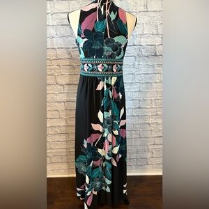 Chic Black Maxi Dress with Pink and Teal Floral Design