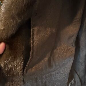 Furs by Talidis vintage 100% mink ladies fur coat in a beautiful chocolate brown color. The fur coat is fully lined in brown satin with a paisley pattern. Features two outside side pockets (velvet lined) and one interior pocket on the right side. Small monogramming on interior right side “TFW”. Features a button closure at the top of coat and two hook-and-eye closures. Rounded flat collar can be worn up or down. Purchased from The Mink Barn (Union, IL) in 1996.