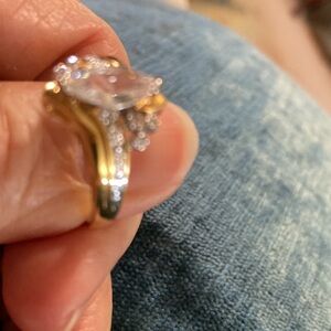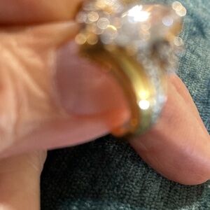 This stunning women's ring features a beautiful blend of gold ( gold plated) , perfect for any occasion. The elegant design is sure to catch the eye and add a touch of sophistication to your jewelry collection.Sz 7/ 7.5 Approx. Beautiful. Approx one carrot man made stone thst is so pretty has a few smaller ones in sides. Ty