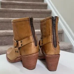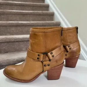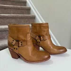 Frye Designer Tabitha Harness Camel Cognac Leather Short Heel Boots Size 8.5
