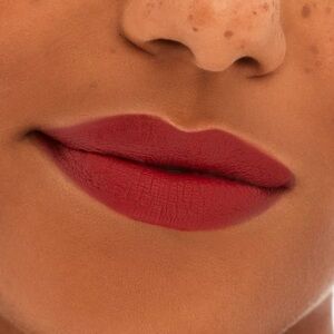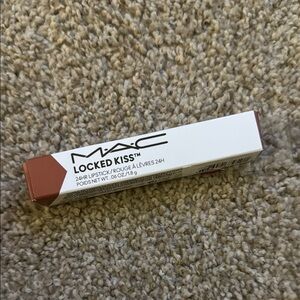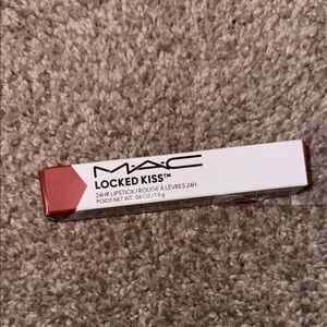 MAC Locked Kiss lipstick. Long-lasting 24-hour wear. Bold red shade.