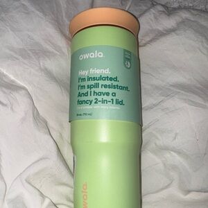 Owala insulated tumbler with a 2-in-1 lid. Features a spill-resistant design.