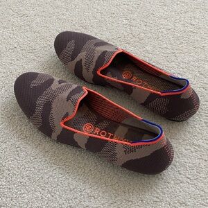 Rothy's flats with a bold camouflage design. Features brown and tan with striking orange trim. These are slightly too small for me. So adorable, like new and in excellent condition.