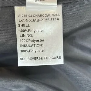 Great condition with no signs of wear. This stylish puffer vest is made 100% polyester. Features dark gray shell with black trimming, three outside pockets and two on the inside. Snap tightening latches on the back.