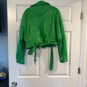 Striking green leather jacket with silver zippers. Features a cropped style and waist belt.