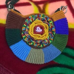 Vibrant crochet shoulder bag with a unique multicolor design. Features shades of blue, green, brown, and yellow.
