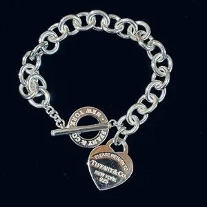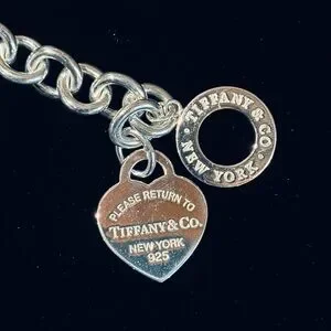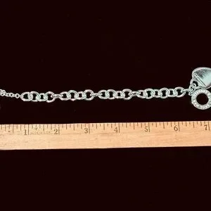 Elegant bracelet with heart charm. Crafted in polished silver. Perfect for any style. Just buffed and polished by jeweler (see receipt attached) to remove engraved initials on one heart and restore the bracelet to like new condition. Looks better in person than the pictures show. I don’t have a great camera. If you are not completely satisfied, I won’t dispute your dispute as I am confident you will be pleased with this item. Tiffany box, small drawstring jewelry bag and paper bag included. The paper bag is slightly damaged.