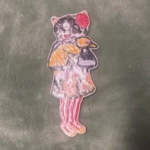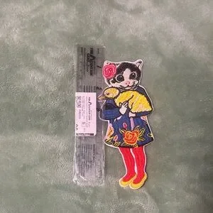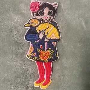 Vibrant cat patch with a floral design. Features red, yellow, blue, and pink colors. IRON ON