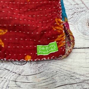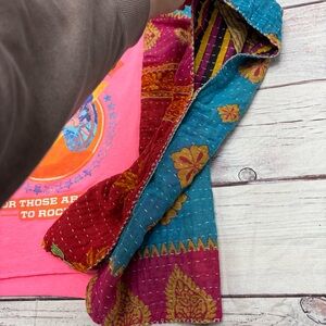 vibrant poncho tee boho kantha patchwork acdc graphic remake artisanal upcycled design festival vibe handmade style bold color soft drape unique silhouette relaxed fit creative fashion statement retro rock energy warm tone outfit effortless flair expressive wardrobe piece