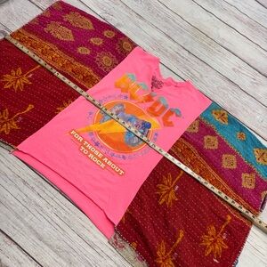 One-of-a-kind women’s AC/DC poncho top featuring a vibrant upcycled pink graphic tee front and stunning kantha-style boho sleeves. Flowy, lightweight, and easy to wear with a relaxed drape that fits a wide range of sizes. Perfect with denim, shorts, or leggings for a fun festival, weekend, or everyday look.