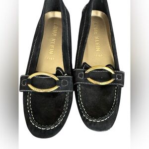 Black suede loafers by Anne Klein with gold-tone logo hardware and cushioned iflex footbed for comfort and flexibility. Clean soles and pristine suede.