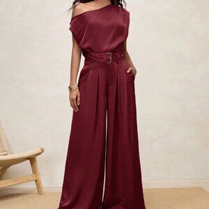 Burgundy Elegant Women's Pleated High Waist Wide Leg Pants with Belt