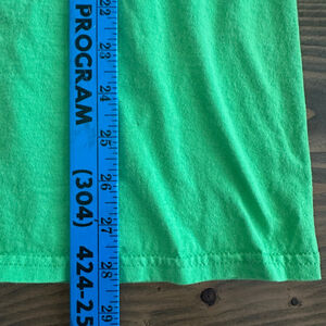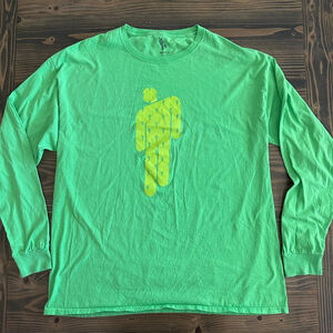 Pre-owned Billie Eilish long-sleeve tee in bright green, size L. Features the large lime “Blosh” figure graphic on the front and “BILLIE EILISH” printed across the lower back. Made of 100% cotton. Measurements are approximately 22.5" pit-to-pit and 28" length. Minor creasing from wear but no major flaws visible.