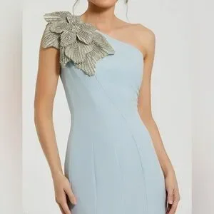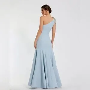 MAC DUGGAL Blue Crepe One Shoulder Gown With Crystal Flower