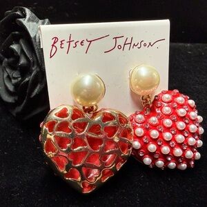Charming red heart earrings with pearl tops. Sparkling accents add flair.