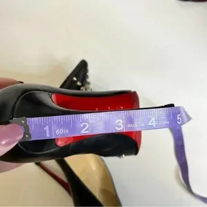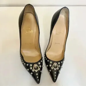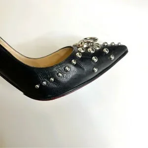 Christian Louboutin So Kate Door Knock black embellished heels. Pointed toe. Does have some wear, look at photos carefully- light scuffing, some wear on toes and creasing, minor wear on heels, some wear on soles. Size 37.