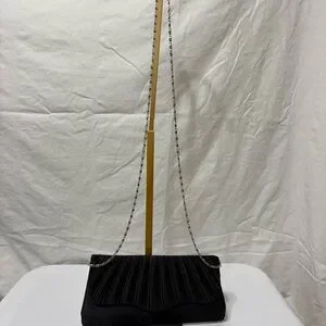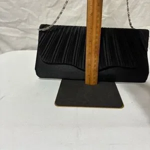 black pleated satin evening clutch bag with a silver chain strap. The distinctive fan-like pleat design gives it an elegant and formal look, suitable for events such as weddings, proms, or cocktail parties.