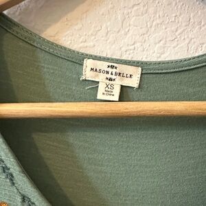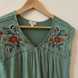 Charming teal blouse with vibrant floral embroidery. Sleeveless design with delicate detailing.
