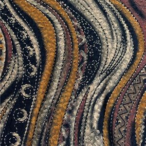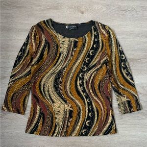 Vintage Brittany Black black 3/4 long sleeve blouse. Cream and tan abstract textured design with metallic details, y2k style. Made in USA. Size petite large.
