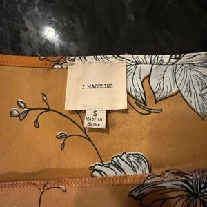 Gorgeous mustard yellow floral crop top with dramatic bell sleeves and added ruffle detail. Tie-front style allows an adjustable fit. Lightweight and flowy polyester with great movement — perfect with high-waisted jeans or skirts.