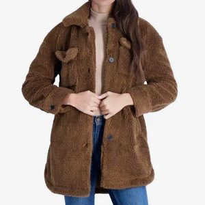 Lucky Brand fully lined collared teddy jacket in brown - front slant pockets - buttoned breast pockets - nice length - new with tags - medium warmth - color depicted as close to actual as possible, but will vary in different light settings