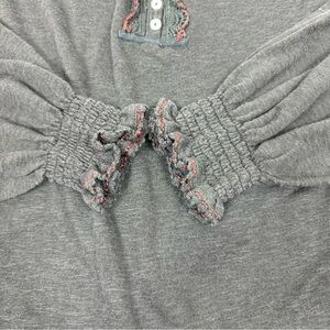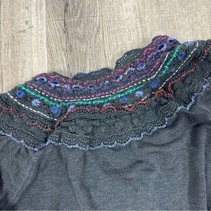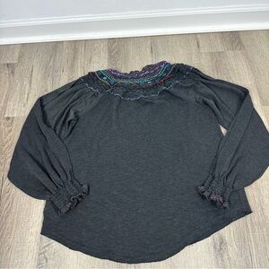 Free People Siesta Fiesta Embroidered Top Long Sleeve Boho Size Medium Dark Gray Shirt with colorful embroidered crochet details around neck. V-Neck. Good used condition.