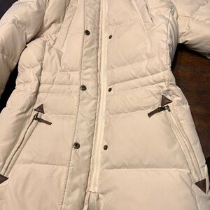 Chic off-white puffer with luxurious faux fur trim. Ideal for cold weather.