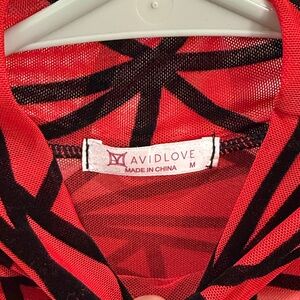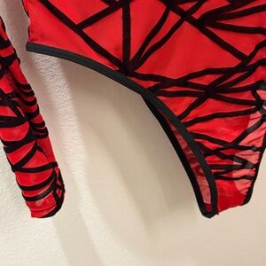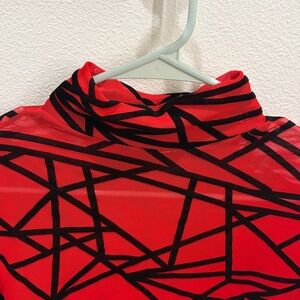 Stylish red bodysuit with black geometric patterns. Features long sleeves and a high neckline.