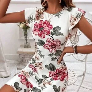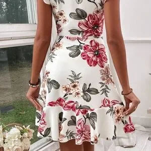 This multicolored dress features a flattering A-line silhouette with a ruffled, tiered design, perfect for a wedding guest occasion. The cap flutter sleeves and crew neck add a touch of elegance, while the vibrant pattern makes it ideal for resort wear.