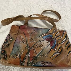 “Anna” hand painted butterfly purse. Beautiful hand-painted leather bag featuring a vibrant butterfly and bamboo design. Rich brown tones with accents of blue, red, and green. Roomy, 4 section purse; 3 sections in main body and additional snap closure section on outside. Purse is “pre-loved condition, leather shows wear on corners and bottom(see photos) but no tears or scuff marks. Bag has overall patina of “stonewashed, comfortable denim”. Interior has two light stains (see photos). Measurement: 16x9x4 with 12 drop on handles.