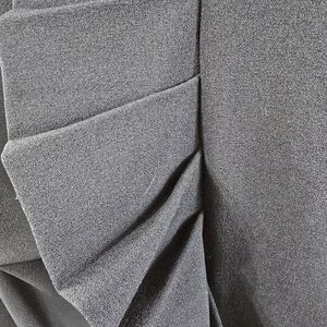 In excellent condition, this solid navy blue stretch crepe gown is perfect for upcoming holiday Christmas party New Year's Eve business work office event gala meeting bridesmaid wedding guest formal feminine coquette pinup festive homecoming prom dance parties and cocktail occasion occasions and has an old Hollywood Glamor look. Off-the-shoulder (silicone backed to help stay in place and adhere to skin) bateau boatneck boat neck neckline with princess seams add elegance and sophistication. Old Hollywood star starlet demure look. Back center hidden zip entry with hook-and-eye closure. Lined. Added spandex for ease of movement. Sheath midi pencil style. Dramatic cascade flat pleats cascading asymmetric ruffle details extend behind the dress length, for an eye-catching look. 17" pit to pit and 41" long, 45" long at longest point of ruffle, measurements are approximate. Front slit at ruffle.