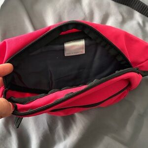 Vibrant red belt bag. Black strap and zipper. Adidas logo on front.