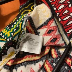 Vibrant dashiki tunic with intricate patterns. Features blue, red, yellow, and black colors.Size Large or 10/12 women