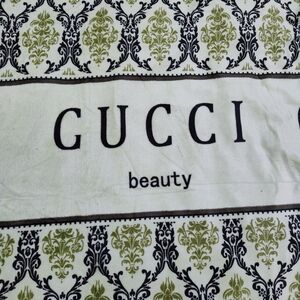 GUCCI Beauty VIP throw blanket + matching Gucci damask gift bag was a boutique promotional GWP set that was never sold retail. The damask pattern in olive and black feels straight out of an Italian palazzo, and the plush microfiber is soft, velvety, and instantly luxe.