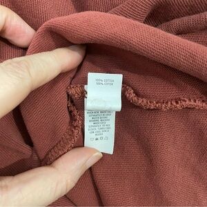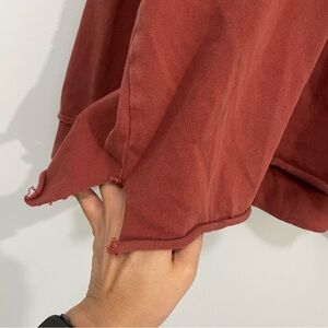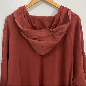 Casual rust hoodie with lace-up detail. Raw bottom hems, slightly high low. Oversized and slouchy fit. Totally broken in.