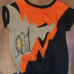 This stunning and unique sweater is guaranteed to turn his. With gorgeous gold thread, bold, bright orange, and even little metal plate details, it is sure to dazzle