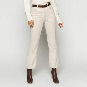 Reformation Cynthia cords featuring a high rise, 5-pocket styling, button fly, full length, straight legs, and a soft 100% cotton corduroy fabrication in off-white/cream.