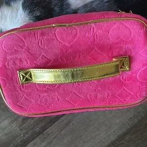 Vibrant pink travel bag with gold accents. Features embossed design and signature logo.