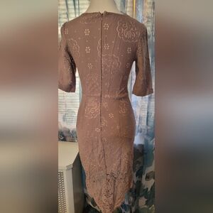 This elegant lace dress features a sophisticated design perfect for any occasion. The taupe color adds a touch of class and versatility to your wardrobe.