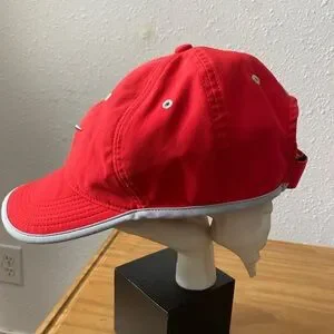 Stylish red hat with gray accents. Features Nike logo. Adjustable strap for perfect fit.