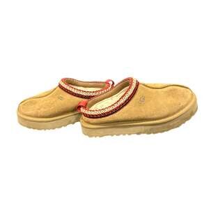 These slippers are warm, comfortable, and perfect for indoors or casual outdoor wear. Quality UGG construction with suede upper, fleece lining, and classic Tasman-style braid around the collar.