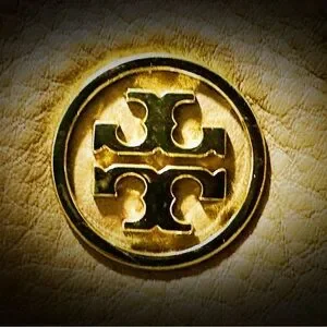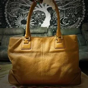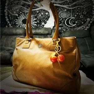 Tory Burch Tan Leather Tote with orange gold cherry keychain Charm