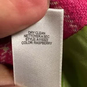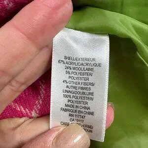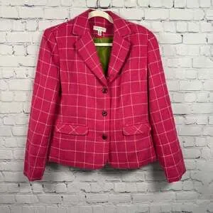 Vintage David Brooks women's blazer jacket in a vibrant pink plaid pattern, size 6. This stylish jacket features a rich wool blend (24% wool, 67% acrylic, 5% polyester, 4% other fibers) perfect for adding a pop of color to any outfit. The internal lining is 100% polyester in a bright lime green, providing a striking contrast. It is designed with a classic two-button front closure and two front pockets. This blazer is in excellent pre-owned condition, well-maintained with no notable flaws. A perfect piece for a unique retro or modern sophisticated look.
